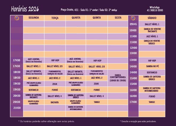 Fazem parte da grade as danças de salão como Sertanejo Universitário, Zouk, Tango, Samba de Gafieira e Forró, bem como as danças livres como Fit Dance, Samba no Pé, Hip Hop, Dança do Ventre, Stilleto/Heels, Ballet, Contemporâneo, Jazz entre outros.